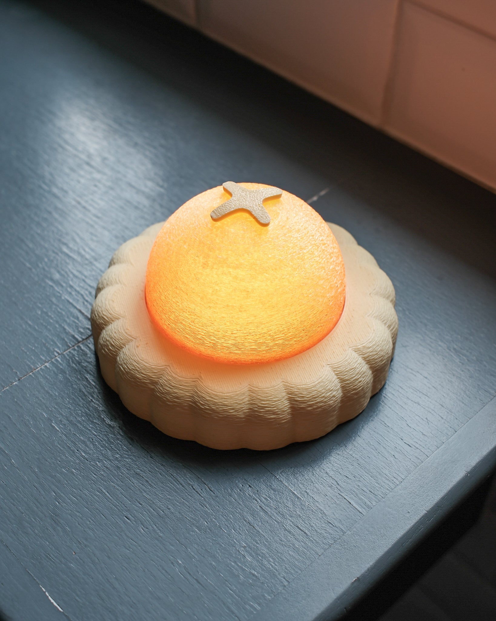 The Pineapple Tart Lamp is designed with layered translucent filament to recreate the soft, fuzzy glow of pineapple jam when light passes through it. This material choice gives the centre its signature jammy look—bright, warm, and slightly diffused, just like the real thing. Surrounding it is a matte, biscuit-coloured shell with a subtly crumbly texture, capturing the familiar look of a freshly baked tart. Together, the contrast in materials and textures brings the pineapple tart to life, turning a nostalgic treat into a gentle, glowing object for the home.